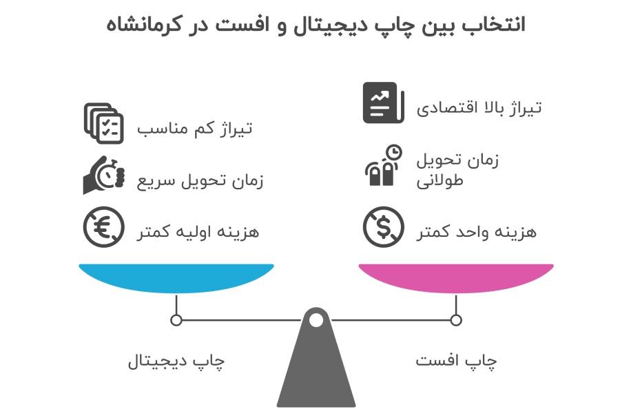 برای چاپهای حرفهای مانند کاتالوگ، جعبه و بستهبندی، مجلات، کتاب و ستهای اداری سازمانی معمولاً چاپ افست بهترین انتخاب است، زیرا علاوه بر کیفیت بالا، در تیراژ زیاد مقرونبهصرفهتر خواهد بود. در کرمانشاه چاپخانههای افست متعددی فعالیت میکنند که برخی از آنها مجهز به دستگاههای جدید و سیستمهای کنترل رنگ حرفهای هستند، اما در برخی مجموعهها ممکن است زمان تحویل طولانیتر یا ثبات رنگ کمتر مشاهده شود.