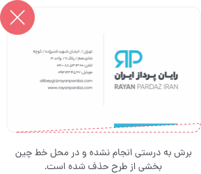 در صورتی که محصول شما از آنچه در توضیحات مربوط به ناحیه اطمینان آماده، بیشتر برش خورده باشد، محصول را در اسرع وقت یا حداکثر ظرف 7 روز پس از دریافت، برای ما ارسال کنید. کارشناسان متخصص ما در چاپ آقا ، ایراد مطرح شده از سوی شما را بررسی کرده و در صورت تایید، سفارش شما مشمول گارانتی شده و مجددا با نظارت کامل، چاپ و ارسال میشود. تصویر زیر نمونهای از برش کارت ویزیت به داخل ناحیه اطمینان است.